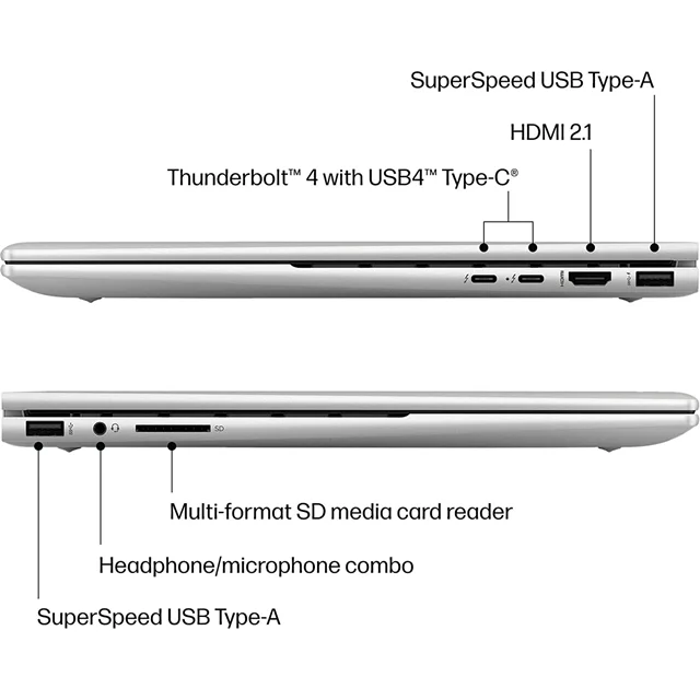 شاسی دستگاه از آلومینیوم نقره ای رنگ ساخته شده است که مقاومت بالایی در برابر فشار یا ضربه داشته و حرارت تولید شده توسط سخت افزار را به آسانی به بیرون از دستگاه هدایت میکند. وقتی لپتاپ را باز کنید با کیبورد و فضای استراحت دست روبرو میشوید که یک روکش آلومینیومی برس خورده آن را مزین کرده است. بلندگوها هم در دو طرف کیبورد قرار گرفته اند تا صدایی فراگیر را به وجود آورند. کلیدها بزرگ و فاصلهدار هستند و با وجود نور پس زمینه کیبورد حتی در شب هم عمل تایپ را لذتبخش کرده و درصد خطا هنگام کار با دستگاه را بسیار کم خواهند کرد، همچنین حسگر تشخیص چهره از حساسیت بسیار بالایی برخوردار است که امنیت رمز های شما را تضمین می کند. حسگرهای لمسی صفحهنمایش هم بسیار حساس هستند و به راحتی تا 5 لمس همزمان را میتوانند به خوبی پشتیبانی کنند. سختافزار این لپتاپها متشکل از جدیدترین پردازندههای مرکزی شرکت INTEL یعنی Core i7 1255U و 32 گیگابایت حافظه رم DDR4 و یک ترابایت حافظه داخلی از نوع SSD M.2 NVMe هستند. وجود گرافیک NVIDIA GeForce RTX2050 با 4 گیگابایت حافظه پردازشی مجزا، با توجه به ابعاد و امکان لمسی بودن و قلم بسیار دقیق HP Tilt Pen این دستگاه، آن را به گزینه ای بسیار مناسب برای کاربرانی مثل طراحان گرافیکی و نقشه کشان که نیاز جا به جایی های مداوم دارند تبدیل کرده است.