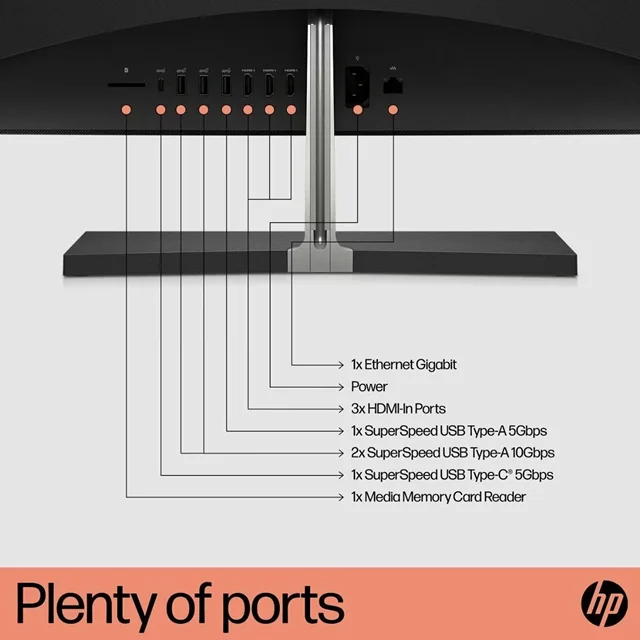 این بسته شامل صفحهکلید و ماوس بیسیم HP 710 مشکی است. همچنین این رایانه دارای ریموت کنترل آهنربایی برای تنظیم صدا و تغییر ورودی HDMI، دانگل داخلی کیبورد و ماوس برای اشغال نکردن پورتهای USB و قابلیت تنظیم زاویه نمایشگر است.