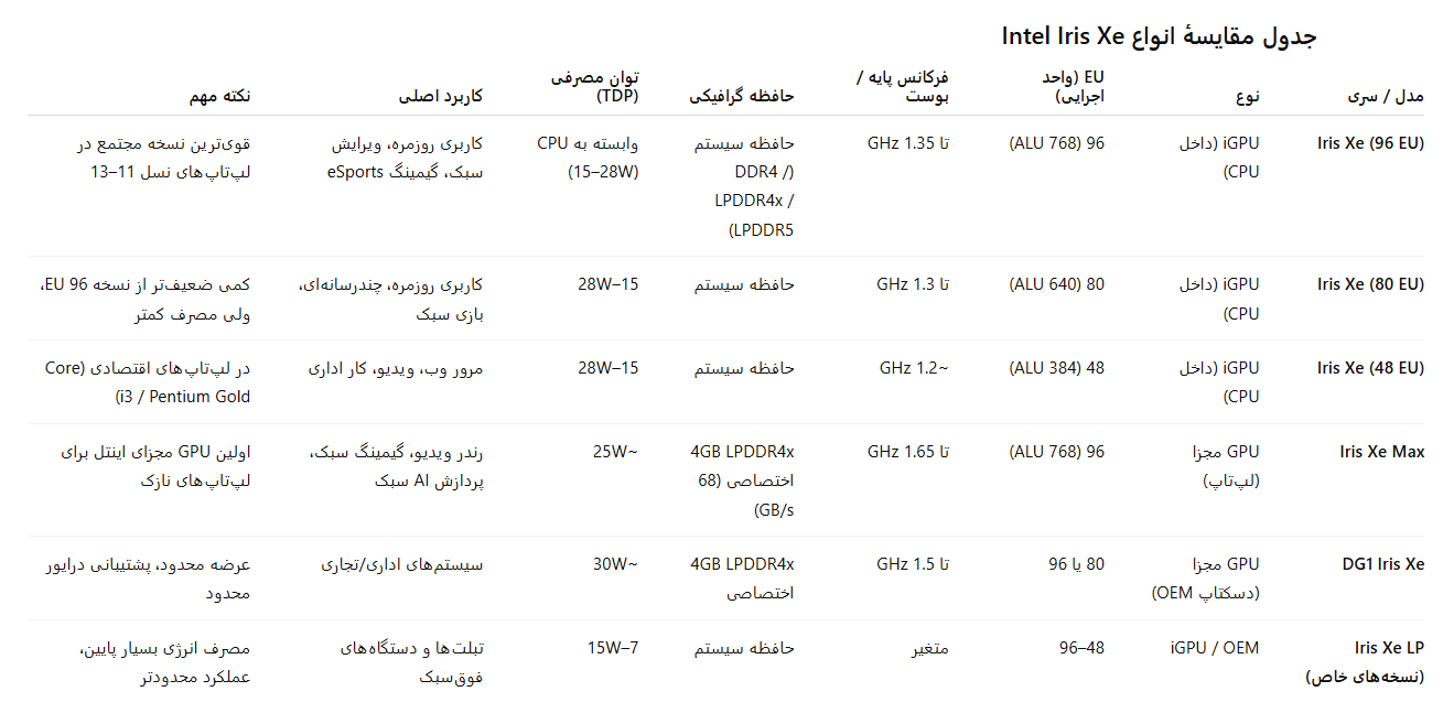 - کاربر عمومی / اداری: iGPU Iris Xe (80 یا 96 EU) کافی است.