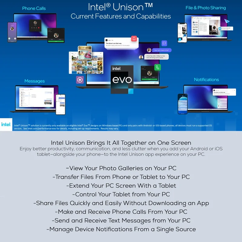 - دارای برنامه Intel Unison مخصوص سری لپ تاپ ها با پردازنده های نسل 13 به بالا با امکان هماهنگ سازی گوشی های هوشمند اندروید و ios جهت نمایش محتوای گالری، انتقال اطلاعات دو طرفه بدون نیاز به اپلیکیشن، نمایش تصاویر لپ تاپ روی گوشی و بلعکس، امکان کنترل تبلت از روی لپ تاپ، اشتراک گذاری فایل ها بین گوشی و لپ تاپ و بلعکس، دریافت Notification، پیام و تماس های دریافتی بر روی لپ تاپ(در سیستم عامل ios برخی ازین امکانات متفاوت می باشد)